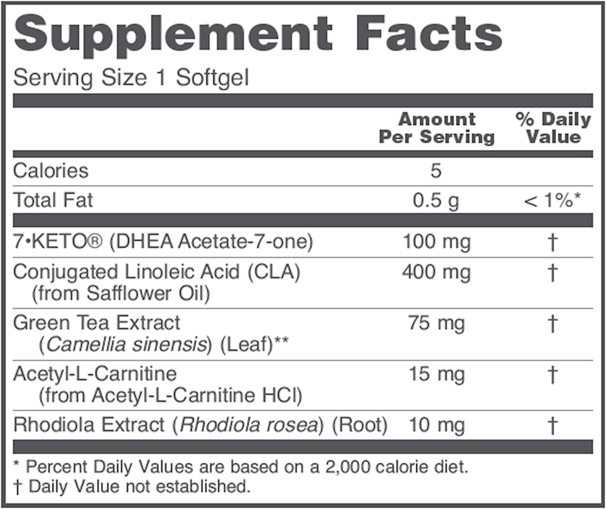 7-Keto-DHEA es un metabolito natural de la dehidroepiandrosterona (DHEA) que alcanza su punto máximo en la edad adulta temprana y disminuye con la edad.* Se ha demostrado clínicamente que 7-KETO® favorece una distribución saludable de la grasa y ayuda a mantener un peso saludable cuando se utiliza junto con una dieta saludable y un régimen de ejercicios.* Además, 7-KETO® LeanGels™ combina 7-KETO® con extracto de té verde, acetil-L-carnitina y extracto de rodiola para favorecer el transporte de grasa celular.*