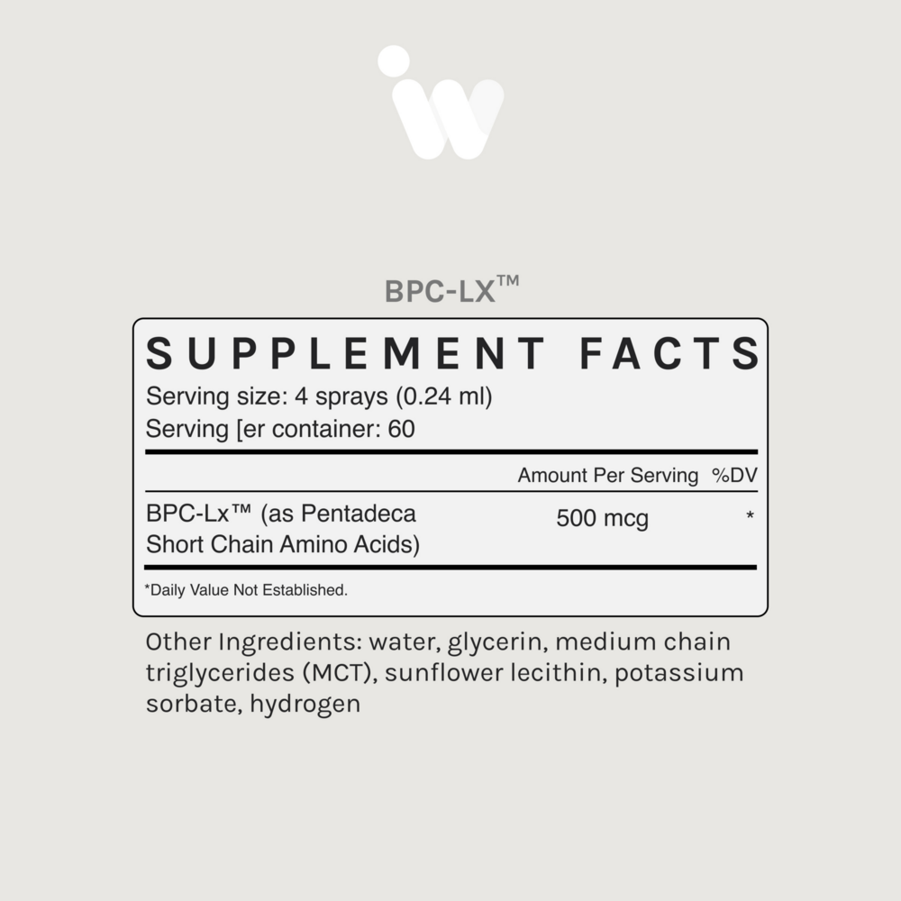 BPC-Lx™ LipoEmulsion™ + Hydrogen-Infused Matrix Next-Gen Precision Short Chain Amino Acid Delivery for Joint Resilience, Gut Integrity & Overall Systemic Balance.* Overview BPC-Lx™ is a next-generation short-chain amino acid formula designed with our proprietary LipoEmulsion™ dispersion system. Delivered as a precision-metered fine-mist spray, the formula combines a calibrated pentadecapeptide with a lipid-based emulsion, suspended in hydrogen-infused, MCT based matrix. This design supports ingredient stability, ease of use, and efficient dispersion through mucosal surfaces, offering a portable format suitable for daily routines or on-the-go use.Unlike conventional oral delivery methods that rely on digestion and absorption in the gastrointestinal tract, the LipoEmulsion™ system is inspired by the most advanced emulsion science. It helps protect ingredients from early degradation, including hydrolysis, oxidation, and enzymatic breakdown. The fine-mist application allows for flexibility while facilitating delivery through non-digestive pathways. The hydrogen-infused water base complements the lipid dispersion system by supporting a stable redox environment, helping maintain the physical and chemical integrity of the formula. BPC-Lx™ reflects a thoughtful integration of formulation science and practical delivery design, offering a modern approach to amino acid supplementation. Features & Benefits*• Supports the body’s soft tissue resilience• Helps maintain gastrointestinal comfort and mucosal integrity• Promotes nitric oxide and redox balance• LipoEmulsion™ matrix supports short-chain amino acid preservation and mucosal absorption• Hydrogen infusion offers added antioxidant and cellular support• Precision-metered spray (125 mcg per activation) for ease, consistency, and serving size flexibility