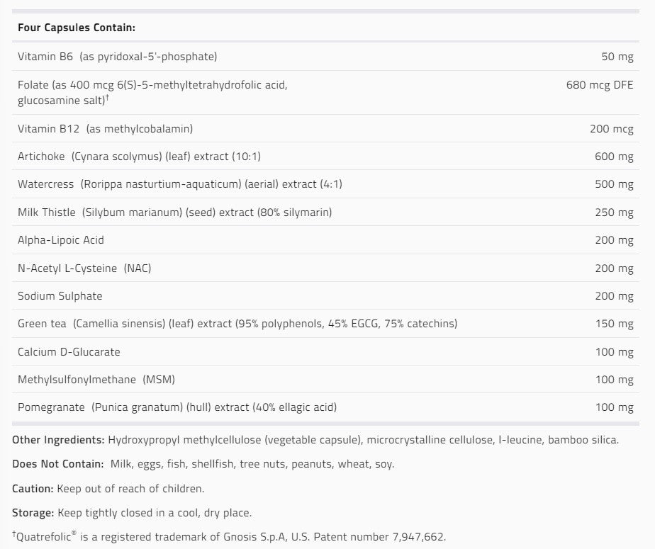 Se ha formulado para contener ingredientes seleccionados, optimizadores de fase dual (DPO), para mejorar las actividades de las enzimas de desintoxicación hepática y apoyar las vías de desintoxicación saludables. El 5-MTHF en esta fórmula, Quatrefolic ® , es la forma biológicamente más activa de folato, lo que permite una rápida absorción en el torrente sanguíneo. El 5-MTHF en esta fórmula también se conoce como la forma "L" de 5-MTHF, ya que es la forma reducida de folato.