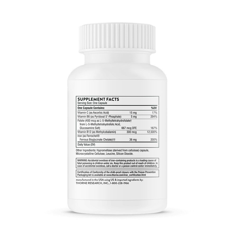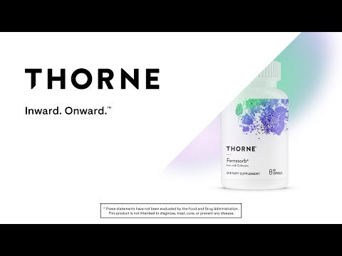 El hierro es difícil de absorber para el cuerpo y la suplementación con formas convencionales de hierro, incluido el sulfato ferroso, puede causar efectos secundarios gastrointestinales, como náuseas, vómitos, estreñimiento, diarrea y heces de color oscuro. Ferrasorb de Thorne contiene hierro reaccionado con glicina para mejorar su absorción en el tracto gastrointestinal, lo que ayuda a disminuir los efectos secundarios típicos de la suplementación con hierro.*