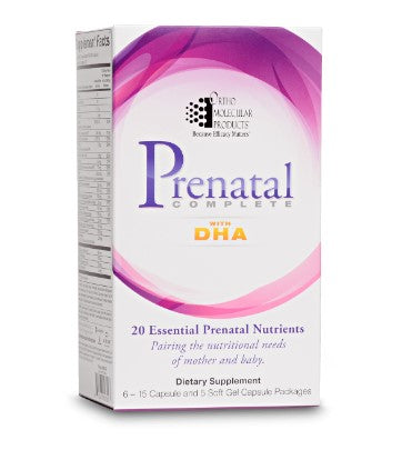 Prenatal Complete con DHA es una mezcla multivitamínica y mineral prenatal integral e hipoalergénica que proporciona nutrientes de alta calidad y DHA de alta concentración para apoyar cada fase del embarazo, desde la preconcepción hasta el posnatal.
