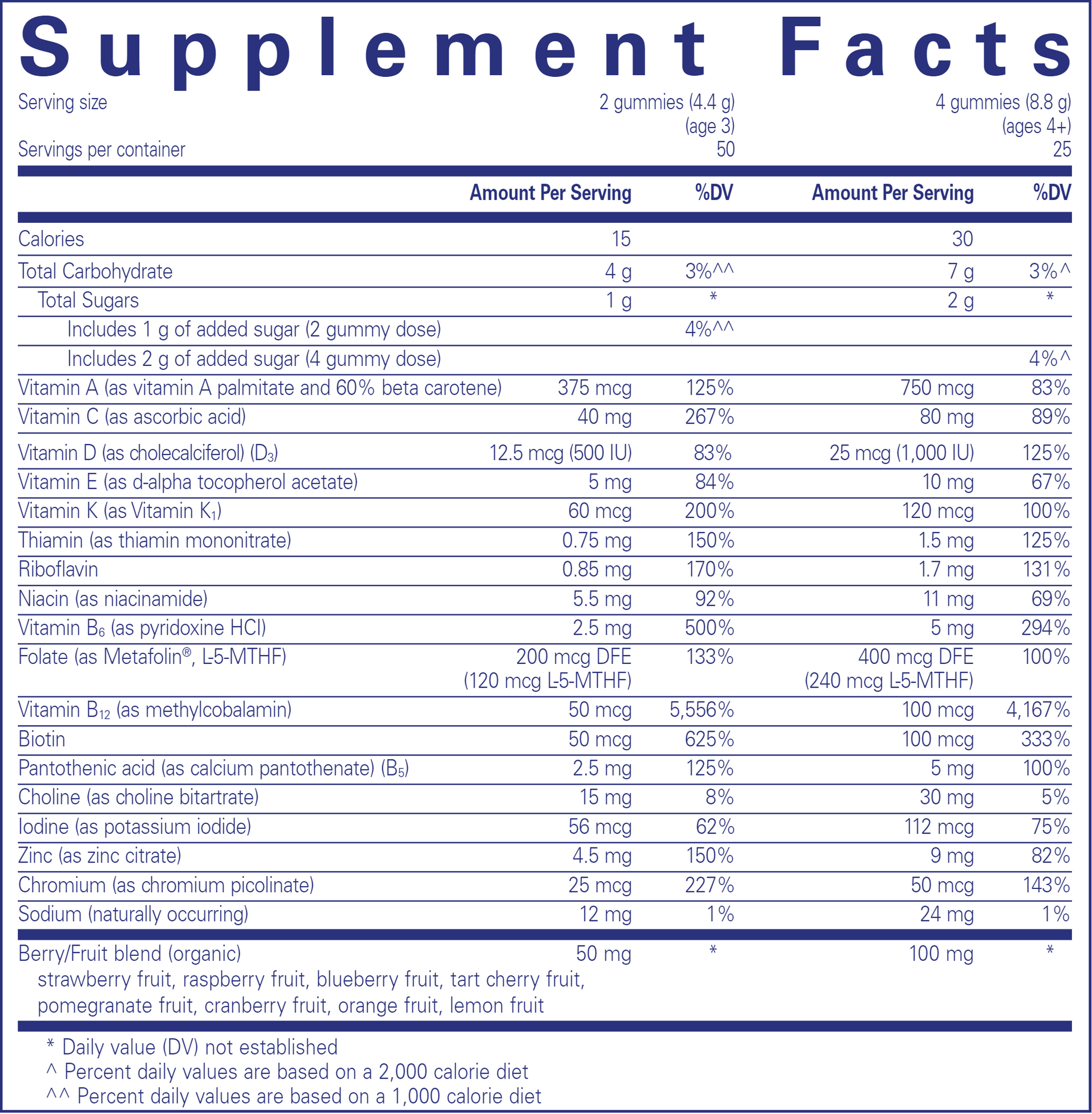 Complejo multivitamínico y mineral integral enriquecido con bayas y frutas orgánicas en una gomita práctica y de delicioso sabor a frutas para niños y adultos.