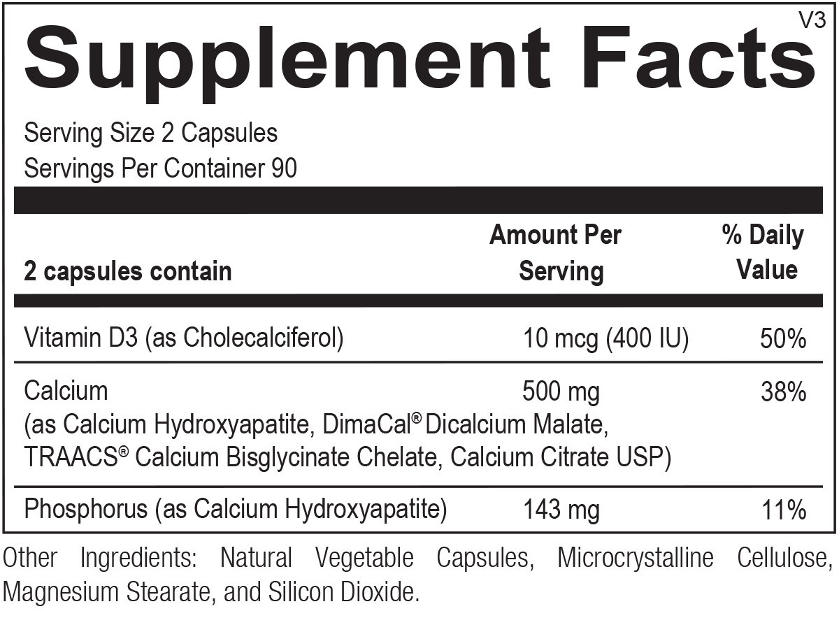 Reacted Calcium proporciona cuatro formas únicas de calcio de alta absorción para garantizar la máxima absorción de este importante macromineral. Mientras que la mayoría de los suplementos de calcio utilizan solo una única fuente de calcio, que puede fácilmente saturar una única vía de absorción y limitar la absorción, Reacted Calcium aprovecha múltiples vías únicas de absorción al proporcionar calcio en las formas de hidroxiapatita, malato dicálcico, citrato de calcio y glicinato. Además, Reacted Calcium incluye vitamina D y fósforo, ambos nutrientes esenciales para la mineralización y remodelación ósea.