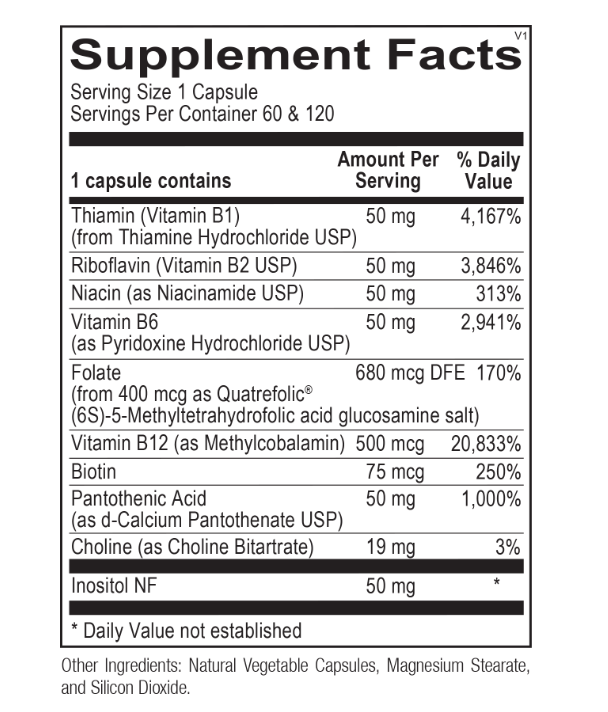 Methyl B Complex is a balanced and comprehensive supplement that includes eight essential B vitamins, along with choline, inositol and folate as Quatrefolic® -100% 5-MTHF. The high-quality ingredients included in Methyl B Complex help build a healthy micronutrient reserve to support energy production in the body.