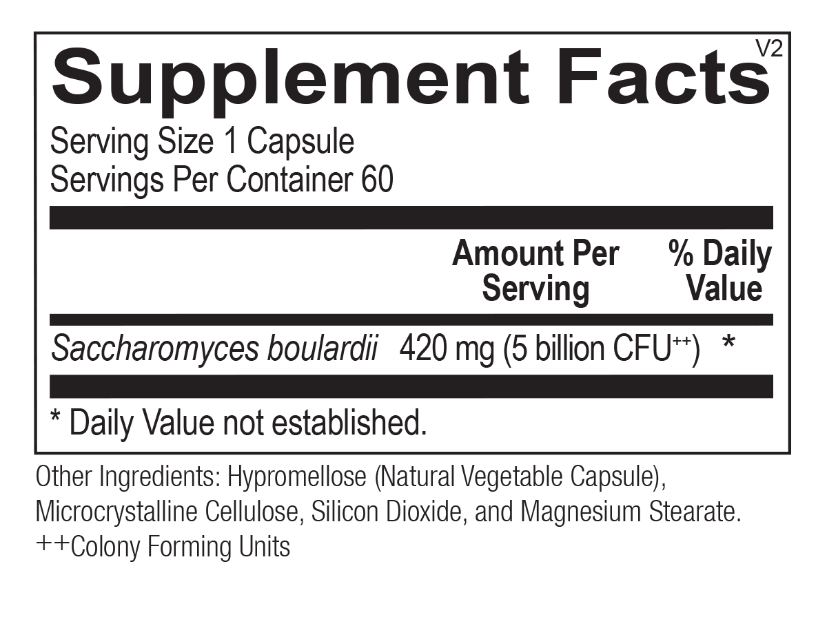 The Saccharomyces boulardii formula includes a probiotic yeast that helps support immune function and balance gastrointestinal flora.